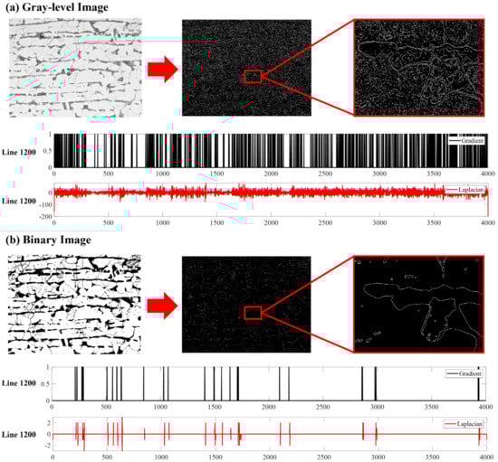 The microstructure of a metal consists of aggregates of grains that have diverse crystallographic lattice orientations with respect to their nearest neighboring grains [] and unique bimodal histogram distributions. The past several years have witnessed rapid progress in investigating GB-mediated deformation using a variety of in situ and ex situ experimental techniques [,,,]. One rapid approach to extracting the metal GBs is accomplished via image processing and optical measurements. The edge-detection method is used to extract the GBs by detecting meaningful discontinuities in the pixel intensity values []. Several edge-detection methods have been proposed in the literature, but they are generally grouped into Gradient and Laplacian approaches [,,]. These edge-detection approaches provide various levels of sophistication and computational efficiency by reducing the amount of data required and filtering out the useless features while preserving information regarding the significant structural properties of the GBs []. Implementing image binarization before the edge-detection algorithm provides a robust tracking ability with low storage requirements and straightforward processing compared to tracking discontinuous values on gray-level images [,]. Many researchers agree that the combination of image pre-processing approaches and image binarization enhances the clarity of an image, thus providing flexible methods for extracting the GBs []. Figure 1 shows a comparison of the edge detection on gray-level and binary images using gradient and Laplacian filters. Image binarization is an image transformation algorithm used to transform a grayscale image into a bi-level intensity image by converting any existing gradation []. Although binary images consist of significantly fewer intensity parameters than their counterparts, such as grayscale and sRGB images, they are more effective in terms of conceiving the shape and size of the object with significantly fewer computational processes, which is very beneficial for object recognition []. The algorithm separates the 0–255 image pixel intensity into a dual collective pixel intensity representing black and white colors. Image binarization works in a manner similar to that of a filter by transforming the unsuitable intensity matrix value of the pixel using a specific threshold separator []. The main focus of researchers is thus to improve the accuracy and reliability of the threshold separator, thus reducing the structural degradation of the image’s parts [,]. Experiments have shown that a uniform threshold value for the entire image dataset makes the extraction process suboptimal, owing to the changes in lamination and the poor image quality, especially at the edges [,]. In the case of extracting a metallographic image of a metal polycrystalline, the careless implementation of a threshold separator can eliminate the essential features of the grain, thus reducing the extraction accuracy of the GB. Unfortunately, the toolsets for automatically adjusting the thresholding are lacking, making the extraction process of GB unreliable.