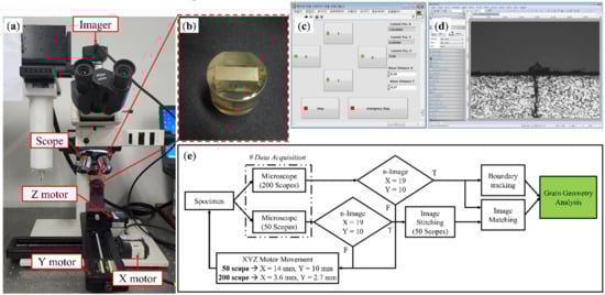 Experimental setup for data acquisition process and geometric analysis of grain boundary using integrated image processing toolsets: (a) optical microscopy setup, (b) mounted specimen, and (c) X-Y-Z stage motor controller based on LabVIEW, (d) microscope user interface, (e) experimental flow chart.