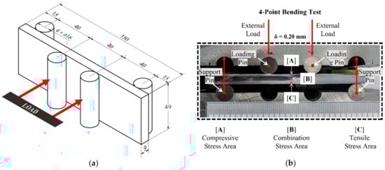 Experimental setup of 4-point bending test: (a) geometric view and (b) top view. The observation was conducted in compressive, tensile, and a combination of compressive and tensile stress areas.