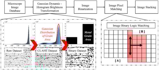 In the stitching process, multiple images were captured using a 50-scope lens and stitched together to create a single image that includes all the areas of the specimen. This allowed us to track the location of one specific grain by tracing the pixel similarity between the 50-scope and 200-scope images. In this study, the microscope image-stitching algorithm was designed based on the image pre-processing, image registration, and image stacking. One of the unique features of the proposed image-stitching algorithm is the use of an FD that utilizes the normal cross-correlation on the edge of the metallographic image based on binary logic matching (BLM), which promises a faster image registration process. This approach improves the conventional feature-point matching methods, which are computationally expensive []. Figure 4 shows the detailed steps and an illustration of the image-stitching algorithm.