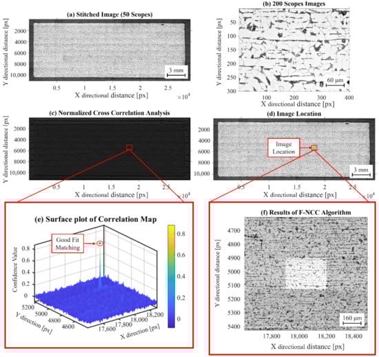 To track the grain location, this image processing toolset integrates a fast normalized cross-correlation (f-NCC) algorithm [,], which is widely used for feature tracking in computer vision. Here, it is used to trace the feature information of the grain location from the stitched 50-scope images. Similar to the proposed image-stitching algorithm, the idea of this algorithm is to cross and match the 200-scope and stitched 50-scope images in the x and y axes, creating a correlation map to determine the grain location. An f-NCC algorithm is an ideal approach for a feature detection that emphasizes the matching quality computation efficiency compared to several algorithms commonly used in academia and the industry because of its advantages of a matching accuracy, adaptability, and resistance to the linear transformation of the gray value by preserving the calculated NCC value [,,]. The implementation of cross-correlation for template matching was facilitated by the squares’ Euclidean distance to interpret the similarity between the image and the feature, which is defined mathematically as follows []: