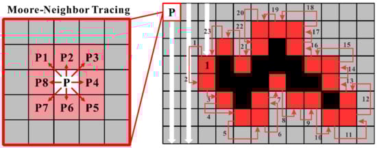 To extract the boundary, the Moore–Neighbor tracing mechanism was integrated into the toolset. This algorithm performs continuous pixel-by-pixel tracing on binary images until specific commands are satisfied. The binarization process using GD-HBT was used to support the edge-detection algorithm. The Moore–Neighbor tracing algorithm, which was updated using Jacob’s stopping criteria, was used to trace the boundary location [,,]. Identical to the implementation of 8-connected pixels in computer graphics (Figure 7), the Moore–Neighbor tracing algorithm consists of a set of eight pixels that share a vertex or edge with the starting pixel . These neighboring pixels (), located in , determine the trajectory, either clockwise or counterclockwise, of pixel P, which serves as a sensor. Every time pixel P hits a black {1} pixel declared as a grain boundary, a sequence signal is stored to shape the contour map of the grain boundary. This process is repeated until pixel P returns to a predetermined initial location. Because the loop terminated when pixel P returned to the initial position, mistaken results appeared owing to a discontinuity of the target shape, which caused pixel P to return to the initial position before successfully tracing all the grain regions. To address this weakness, Jacob’s stopping creation was utilized by modifying the termination command, which stopped tracing if pixel P returned to the initial position in the same manner as the initial visits. This improvement significantly improved the Moore–Neighbor algorithm, providing a robust contour extraction algorithm for the tracking of the grain boundary.