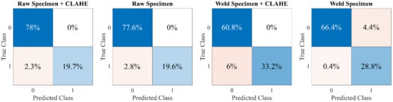 All the computation processes were performed using MATLAB R2021a software and several built-in program extensions, including a ground-truth labeler, image labeler, and image-processing toolbox to support the computation and testing processes. All of the training, testing, and analysis processes were performed using a Dell ALIENWARE PC with an Intel® Core™ i9-9900HQ 3.6 GHz of CPU and 32 GB of RAM. The testing process was started by evaluating the proposed GD-HBT algorithm () using a confusion matrix of the prediction and ground-truth models, which were developed manually using a ground-truth labeler (Figure 8). In total, eight performance evaluation metrics were analyzed: the extraction accuracy using binarization accuracy, F1 score, area-under-curve (AUC), negative rate matric (NRM), prediction balanced error rate (BER), peak signal-to-noise ratio (PSNR), distance reciprocal distortion (DRD), and misclassification penalty metric (MPM). Two variations of the dataset were performed: direct binarization on the raw image dataset and a dataset with CLAHE pre-processing. The analysis also included three existing image binarization algorithms: Otsu’s method [], adaptive thresholding [], and global thresholding. It was found that GD-HBT achieved promising results by improving all of the evaluation matrix scores compared with the existing algorithm. In addition to the accuracy, the harmonic mean of the model’s sensitivity and specificity elucidated a convincing trend to validate the overall performance of the algorithm (Table 1). When dealing with smaller grain sizes on the weld dataset, the GD-HBT performance was relatively stable by maintaining the ratio of NRM, BER, DRD, and MPM at relatively optimum scores. This is essential because stitching processes using BLM can be improved along with the binarization performance. A robust binarization algorithm provides a valid feature input that potentially elevates the stitching accuracy. In terms of pre-processing, image binarization using CLAHE was found to perform better across all types of thresholding methods. This is the same trend as discussed in Section 1, where the image binarization preceded by pre-processing promotes a relatively higher extraction performance by enhancing the image’s clarity []. A comparison of the binarization image results and confusion matrix analysis of each method can be found in Figures S7–S9.