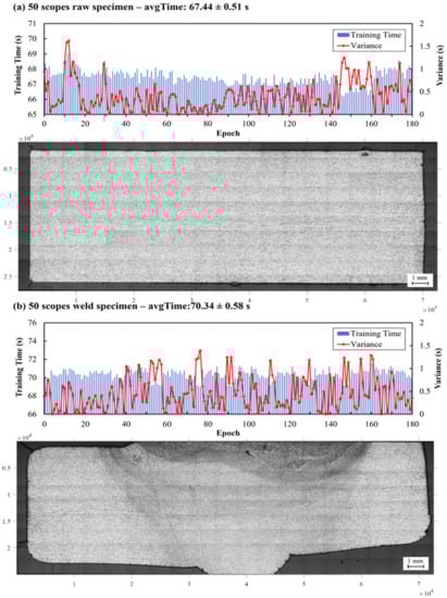 The final results of the 50-scope stitched image and analysis of training time: (a) raw and (b) weld specimens.