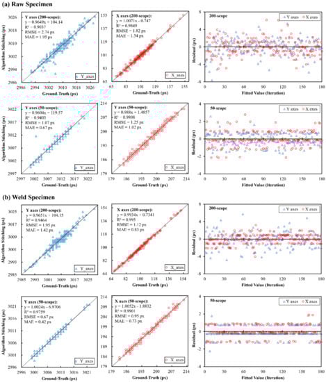 To create a credible ground-truth dataset, the validation images were captured at each overlapping point between the four edges of the image (Figure S10). Validation images are used to determine and validate the similarity of the grain shape trends of each ground-truth. This method successfully generated a proper and credible model containing the x and y coordinates of the ground-truth model as the input value for linear regression analysis to test the predicted anchor point model. To make a generalized assessment, the 200-scope raw and weld datasets were included in this analysis. Thereafter, the predicted and ground-truth models were plotted using linear regression analysis based on the least-squares methods. The model’s bias and variance were assessed using four performance metric analyses: the coefficient of determination (R2), root mean square error (RMSE), mean absolute error (MAE), and residual value. As shown in Figure 11, the performance of the stitching algorithm using BLM exhibited encouraging results, and the regression model showed satisfying trends, with insignificant bias and variance and a relatively low variability in producing consistent predictions on four different dataset variations. The results indicate a good performance with a relatively high coefficient of determination that can be generalized for predicting the reliability of the future trends of the model. These results are supported by robust model’s performance, which is indicated by the evaluation metrics. It was found that the RMSE of the stitching algorithm using BLM remained relatively low. From the eight models trained during the assessment, the highest and lowest RMSE values recorded by the model were 2.74 and 0.67 pixels on the 200-scope (y-axis) raw specimen and 50-scope (y-axis) weld specimen models, respectively. This is proportionately low compared to the input feature, which had pixels on each image. The MAE performance exhibited maximum and minimum values of 1.95 and 0.42 pixels, respectively, with the same trend as the RMSE values.