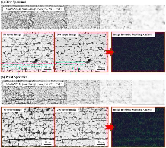 The results found that the matching performance exhibited consistency and a homogeneous performance on each FD in terms of the robustness, visual quality, and a metric parameter (Table 2). The algorithm successfully maintained the RMSE for less than three pixels and MAE for less than two pixels, with an exceptional coefficient of determination that was close to one in both the raw and weld specimens. There was no indication of a performance drop because the average residual remained close to zero. The results are also supported by the SE, t-statistic, and p-value values recorded during the testing, which were identical for each FD. This is essential, owing to the fact that the deformation of the metal grain is on the microscopic scale. A fundamental error in determining the global location will cause extensive issues in the in situ assessment of the grain deformation. This encouraging result supports the image-intensity stacking analysis corresponding to the structure locations.