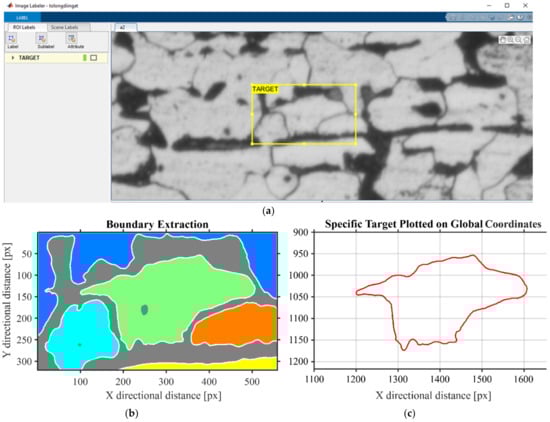 Grain boundary extraction processes: (a) target grain labelling using built-it MATLAB apps “Image Labeler”, (b) extraction results using Moore–Neighbor tracing algorithm with updated Jacob’s stopping criteria, (c) plot of specific grain on global location coordinate by integrating the stitched image, matching, and boundary coordinate.