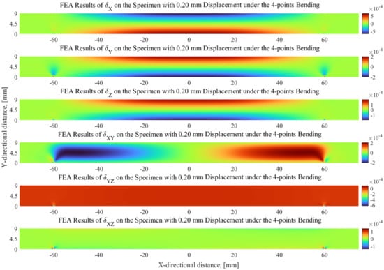 The results of numerical approach using FEA on structural simulation of 4-point bending test including deflection components in the x (, y (), and z () directions and shear deflection in the xy (), yz (), and xz () directions.