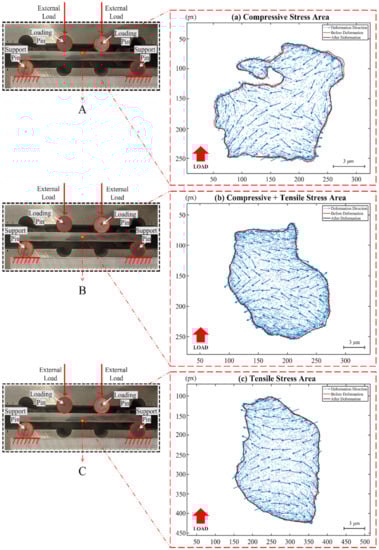 As an example of the implementation, FEA analysis was performed for a comparison, including deflection in the x (), y (), and z () directions and the shear deflection in the xy (), yz (), and xz () directions (Figure 15). The strain vector at three specific locations, i.e., the compressive (A), combination (B), and tensile (C) stress areas, was assessed using a four-point bending test (Figure 16). After applying a deflection of 0.2 mm to the system according to the FEA analysis, uniform deformations of 0.511 μm, 0.013 nm, and 0.511 μm were expected to occur in regions A, B, and C, respectively. However, in the grain-level assessment using the proposed algorithm, the deformation did not occur in a uniform direction. As shown in Figure 16a, in the specific analysis in location A, where a compressive deformation of 0.511 μm was expected to occur owing to the compressive stress, there was an internal compression with the maximum magnitude of 0.433 μm. Likewise, at location B, where a deformation of 0.013 nm was expected owing to the compressive and tensile stresses, the compression and local shear stress of 0.154 μm was observed at the top and 0.077 μm at the bottom, as shown in Figure 16b. At location C, as shown in Figure 16c, where a deformation of approximately 0.511 μm was expected owing to the tensile stress, the local shear stress on the grain of 0.232 μm at the top and 0.310 μm at the bottom was clearly observed. It is related to the normal and shear stress on a boundary in a homogeneous body corresponding to the boundary orientation []. This result implies that the deformation analysis obtained by the numerical–analytical approach of the stress–strain on specific structures is very difficult to apply at the grain level (Figure 17). However, the experimental approach to the stress–strain in a specific region using a metallographic observation can effectively provide a high spatial resolution for tracing the microscopic deformation at the grain level. Thus, it is suggested that the algorithm proposed in this study is a tool to quantitatively measure the micro-deformation at the metal grain level (Figures S16–S18).