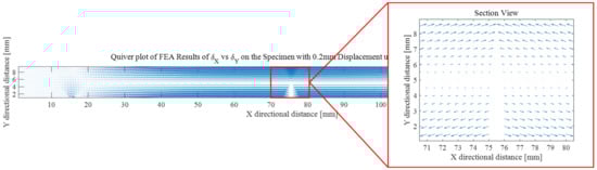 Vector plot of FEA of deflection components in the x () vs. y (), on structural simulation of 4-point bending test.