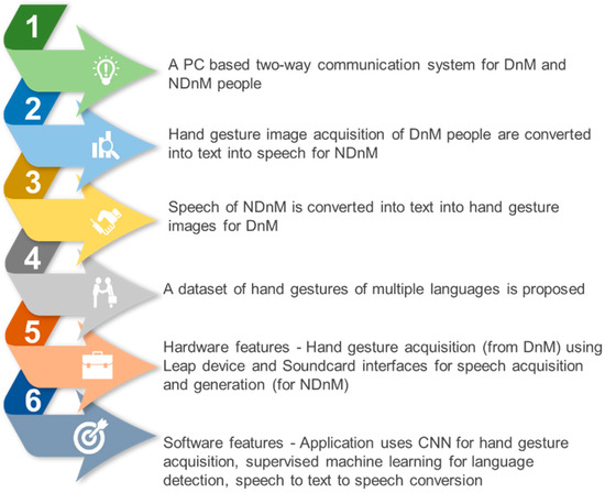 Figure 3 presents the six key features of this PC-based system. The proposed system is low cost and provides two-way communication between DnM and NDnM people. The system proposes a dataset for supervised machine learning to detect languages. The system uses a leap device t and a sound card for two-way communication. The proposed system provides a complete solution for communication between DnM and NDnM people. A unique feature of this system is its proposed dataset for detecting multiple languages. The PC software application is developed in LabVIEW version 2019 [].