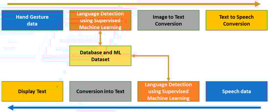 Figure 5 shows the various software building blocks. The gesture data are acquired and processed by the Leap device. The processing is based on MobileNet to detect gesture data. The data are then fed to the PC software application, which is developed in LabVIEW. The data are first processed using a supervised machine-learning algorithm that detects the language. This is done using a dataset created as part of this research work. The LabVIEW application then converts this into text that the NDnM person can read. The last step is to convert the text into speech, which is generated through a PC sound card. This completed the communication from DnM to NDnM. The NDnM person records the speech using a PC sound card microphone input. Speech is acquired, and then language is detected using supervised machine learning. The detected language is then converted into text, which is finally displayed for the DnM person to read.