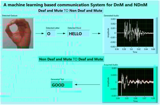Figure 7 shows a screenshot of the main software application. In this instance, the DnM person generated 5 gestures, i.e., ‘H’, ‘E’, ‘L’, ‘L’, and ‘O’, which are detected at a time. The software application created the word using these. Finally, the text is converted into audio and generated for NDnM people to listen to. In response, the NDnM person replied with the word ‘GOOD’, which is acquired through microphone input and converted from speech to text for the DnM person to read.