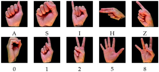 Alphabets A to Z and numbers 0 to 9 are used for validation. Within the dataset, there are 1820 images of alphabets A to Z and 700 images of numbers 0 to 9. These images show different variants of these alphabets and numbers. The number of images is appropriate for the evaluation of the algorithm. Images of some alphabets and numbers selected randomly are shown in Figure 8. These images provide a variety of gestures that are detected and evaluated.