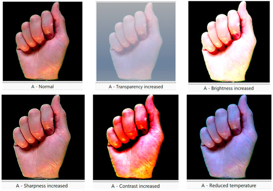 In this experiment, different variants of one image of ‘A’ are selected, and hand gesture detection is processed. The gestures in all the images are identical, and only the quality is varied. Figure 9 shows the software screenshot showing the different qualities of the same image of gesture ‘A’. The image quality is changed to create five more images of gesture ‘A’, and then these images are processed using the image detection algorithm.