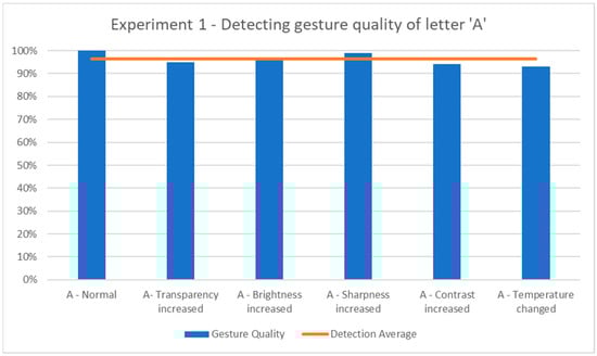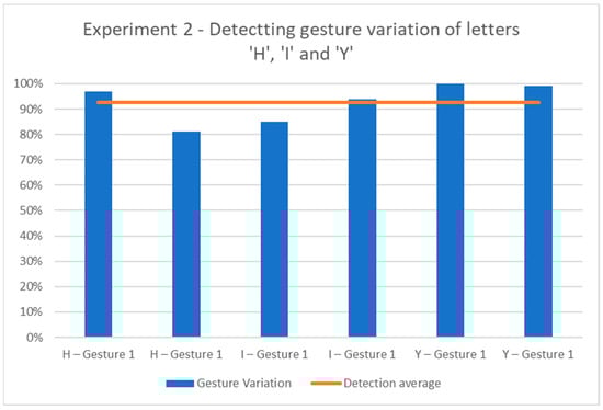 The results of the experiment are shown graphically in Figure 12. For this experiment, three different letters are selected with two slightly different gestures each. The detection accuracy is between 81% and 100%. As mentioned, in experiment 1, each image is processed 100 times. It is concluded from this experiment that the accuracy of some gesture variations is less than 90%. The overall average of correct detection in percentage is approximately 93%.
