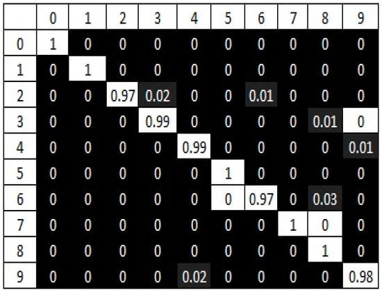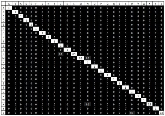 The performance of the system is further evaluated using a confusion matrix. This is an N x N matrix, where ‘N’ denotes the number of target classes. The matrix compares the actual values and the values predicted by the machine learning algorithm. This provides a comprehensive picture of the performance of the machine learning algorithm. This also highlights errors in detecting gestures. The actual or expected values are shown in the columns, while the values predicted by the algorithm after detecting the gesture are listed in rows. The confusion matrix for letters ‘A to Z’ is shown in Figure 13, while the confusion matrix for numbers ‘0 to 9’ is presented in Figure 14.
