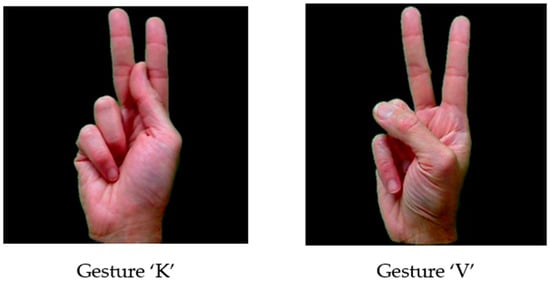 The reason for incorrect gesture recognition is due to some similar gestures. Similar gestures are shown in Figure 15. The accuracy of the detection of similar gestures is both dependent on the machine learning algorithm as well as on how correct the user’s gesture is.