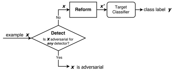 - Meng, D.; Chen, H. MagNet: A Two-Pronged Defense against Adversarial Examples. In Proceedings of the 2017 ACM SIGSAC Conference on Computer and Communications Security, Dallas, TX, USA, 30 October–3 November 2017. [Google Scholar]