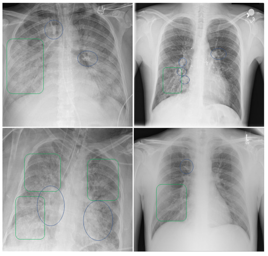 Figure 14 shows an example of typical chest X-ray images used for diagnosis. It can be observed that there are ground-glass opacities in the lungs of certain patients, which are identified using green rectangles. Pulmonary lobes and patchy consolidations are identified using blue ovals, indicating the presence of fibrosis or nodules. Doctors often use these features to determine whether patients are in a state of pneumonia, as well as its severity. Our model is designed to learn these features in order to achieve correct classification.