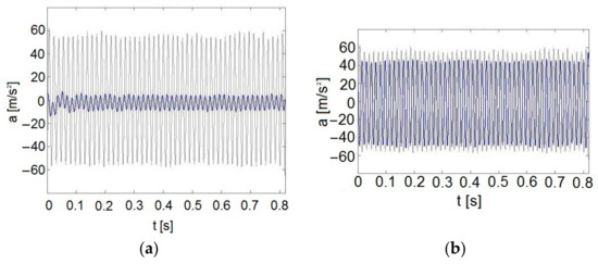 A comparison of the time waveforms of the acceleration of spool oscillations among the results of the experiments and the simulations after estimation is presented in Figure 13. The figures show a comparison of the estimated parameters of model 1 (13), model 2 (23), model 3 (28a) and model 4 (29) for the measurement series where equivalent spring stiffness equalled 1632 N/m and the oil used was HL68 oil at a temperature of 20 °C.