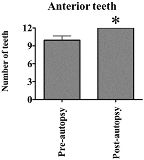 Differences in the number of anterior teeth examined in the pre- and post-autopsy groups. In 30 bodies from which dental findings were obtained before and after autopsy, the number of anterior teeth from which dental findings were obtained is compared between the pre- and post-autopsy groups. The mean number of anterior teeth is 10.0 and 12.0 before and after the autopsy, respectively. The number of anterior teeth is significantly higher in the post-autopsy group than in the pre-autopsy group (* p < 0.05 vs. the pre-autopsy group; n = 30; the values are presented as the mean ± the standard error).