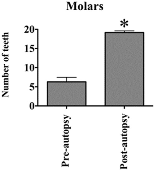 Differences in the number of molars examined in the pre- and post-autopsy groups. The number of molars is compared between the pre- and post-autopsy groups, in the 30 bodies from which dental findings were obtained before and after autopsy. The mean number of molars is 6.3 and 19.2 before and after the autopsy, respectively. The number of molars is significantly higher in the post-autopsy group than in the pre-autopsy group (* p < 0.05 vs. the pre-autopsy group; n = 30; the values are presented as the mean ± the standard error).