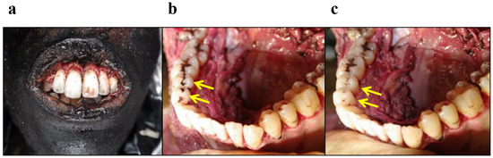 Misidentification of residual soot remaining in a fissure as metal fillings. (a) The frontal view before autopsy. Before imaging, opening the mouth and removing the lips were attempted in vain. (b) The mandibular occlusal surface view after autopsy. Presumed metal filling-like findings are visible and confirmed in a fissure on the occlusal surface of the mandibular right first and second premolars (arrows). This finding is not metal fillings and was ultimately identified as soot. (c) The mandibular occlusion view after autopsy and repeated oral cleanings. Soot in a fissure on the occlusal surface of the mandibular right first and second premolars has been removed (arrows).