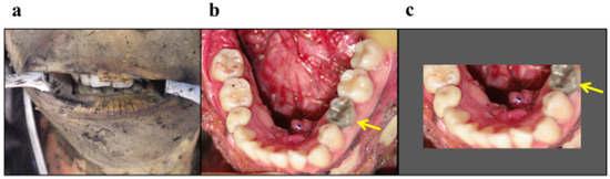 Misidentification of the primary molar as molar teeth because of the narrow opening of the mouth. (a) The frontal view before autopsy. Opening of mouth and removal of lips was attempted in vain before imaging. (b) The mandibular occlusal surface view after autopsy. Late residual mandibular left second primary molar led us to determine a missing premolar. The arrow indicates the tooth mistaken for the mandibular left first molar with previous insufficient mouth opening. (c) The photographic image of the mandibular occlusal surface view when the mouth is less open.