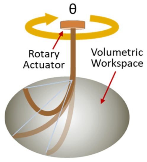 where θ is the rotation angle of the base actuator. The location of the tip T in Equation (4) is defined by three DOF, and hence indicate a volumetric workspace, as illustrated in Figure 3.