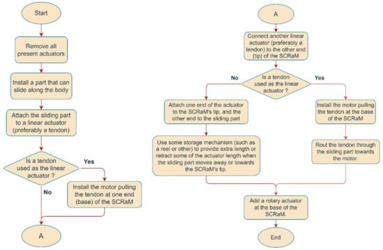 The steps to reduce the number of actuators are as follows: First, all the SCRaM’s actuators are removed, and then a sliding part is installed on the body of the SCRaM. The sliding part would be used to alter the length of the bending segment. A linear actuator is used to move the sliding part by connecting it to the manipulator’s base. If the used actuator is a tendon, then its driving motor could be placed at the SCRaM’s base. Another linear actuator is used to connect the SCRaM’s tip to the sliding part. If a tendon is used for this connection, then its motor could also be placed at the SCRaM’s base and the tendon routed from the motor, through the sliding part, to the tip of the SCRaM. However, if another type of linear actuator is used to pull the SCRaM’s tip, then an arrangement should be made to change the initial length of the actuator to match the length of the bending-segment below the sliding part. Finally, a rotary actuator is placed at the SCRaM’s base and used to rotate the manipulator to any direction, thus producing a 3D workspace. Figure 4 shows the process in the form of a flowchart.