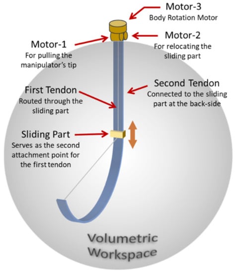 Based on the selected configuration, the manipulator would have a tendon to pull the tip, another tendon to relocate the second attachment point of the first tendon, and finally, a motor at the base to rotate the whole manipulator, thus achieving three DOF, and therefore a volumetric workspace. By applying the selected configuration, a broad design for the manipulator emerges, as illustrated in Figure 5. Being suspended, the manipulator has a straight posture when relaxed and curved when the first tendon is activated through motor 1. The sliding part is driven by the second tendon through motor 2. The sliding part constrains the arm at its location, resulting in a curved arm segment below and a straight unactuated segment above. The tendon pulling the arm’s tip is routed through the sliding part towards its relative motor at the manipulator’s upper base. Hence, the sliding part can be referred to as an arm constrainer and tendon router (ACTR). Through this design, the manipulator has three DOF, provided by the one rotary and two linear actuators.
