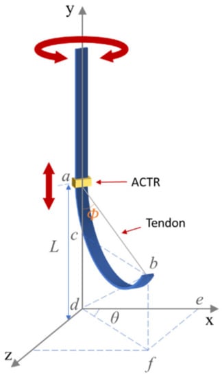In this model, L represents the length of the bending segment, ab represents the tendon’s length between the two ends of the bending segment, and cd represent the tip’s displacements in Y axis direction. Initially, at rest position, the bending segment’s length L is calculated as: