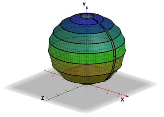 The volumetric workspace of the manipulator can be obtained by using Equations (9) and (10), and by stepping through the values of φ and θ, as illustrated in Figure 7.