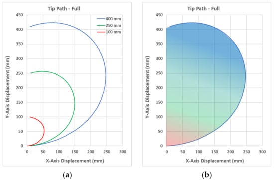 where N is the number of winch-pulley rotations, L is the length of the bending segment, representing the arm section below the ACTR, and r is the radius of the winch-pulley. The ACTR in Figure 8 represents the tendon’s second attachment point. To obtain the response of the manipulator’s arm for different bending segment lengths, the FEA test was performed for three ACTR locations: 100, 250, and 400 mm. These locations produced bending segments that are 20%, 50%, and 80% of the arm’s full length. The different bending segment lengths provided different trajectories of the arm’s tip in a planar workspace, as shown in Figure 9a. The tip trajectory depends on the location of the ACTR which determines the length of the bending segment. Accordingly, the variable location of the ACTR produces a planar workspace, as shown in Figure 9b. By applying θ values covering the full rotation of the manipulator about its vertical axis, a volumetric workspace emerges, as illustrated by Figure 10.