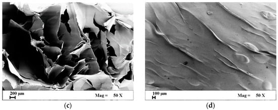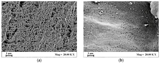 FE-SEM images in Figure 2a,b show that the aerogels were characterized by a regular micro- and nano-porous morphology, with open and interconnected pores in the cross-section and on the surface of the sample; whereas cryogels showed a less regular macroporous structure (Figure 2c,d). Supercritical drying is able to preserve the nanofibrous structure of the starting hydrogel thanks to the zero-surface-tension of the supercritical mixture CO2 plus organic solvent, formed during the drying process [,]. In the case of freeze-drying, the nucleation of ice crystals and their subsequent removal by sublimation tend to destroy the gel nanostructure. In particular, freezing and sublimation steps led to the development of significant stresses within the polymeric matrix since, during freezing, water expands, and mechanical stresses are exerted on the surrounding polymeric chains; moreover, capillary stresses destroy the gel nanostructure during ice crystals sublimation [,,,,].