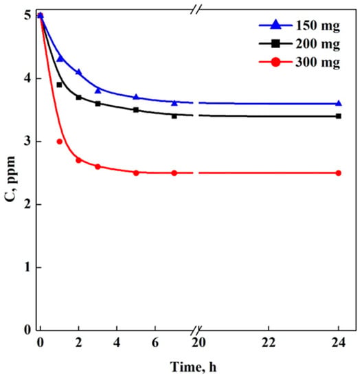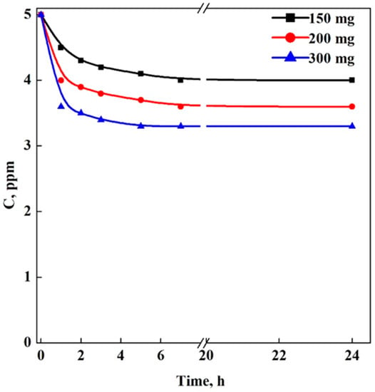 Adsorption kinetics of aerogel samples analyzed in the experiments of Set A (Aerogels) performing a batch adsorption (T = 25 °C, rpm = 200, λ = 591) and using three different amounts of aerogels: 150 mg (blue line), 200 mg (black line) and 300 mg (red line).