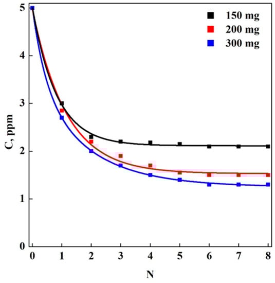 To improve the adsorption performance, adsorption tests in multi-step mode were realized, using again different amounts of aerogel (150, 200 and 300 mg for the Set A1, A2 and A3, respectively). The apparatus used for these experiments is reported in Figure 1. The filtered flow rate was about 0.1 mL/min and the resulting concentrations, after each step of filtration and for each experiment, are also plotted in Figure 5, in which CV concentration is graphed against the number of steps (N).