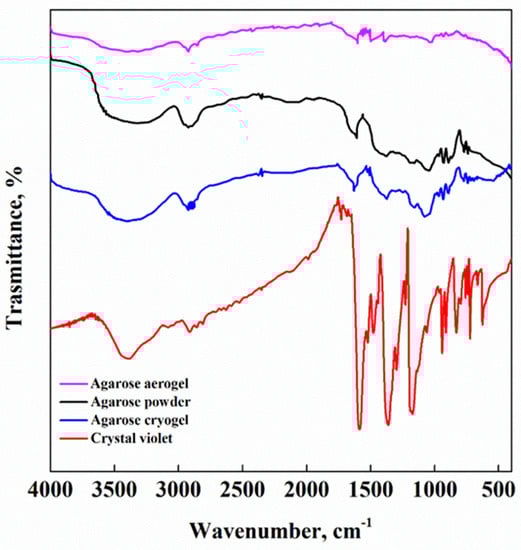 In Figure 7, FT-IR spectra of agarose powder, crystal violet and agarose aerogel and cryogel after CV adsorption tests are reported.