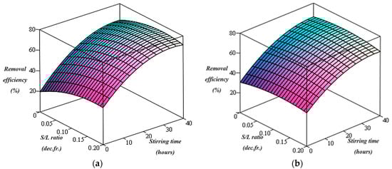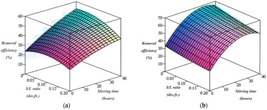 The graphical representation of the dependence of lead removal efficiency on the two variables of the washing process (stirring time and S/L ratios) obtained from the determined mathematical relations is illustrated in Figure 2a,b in the cases of using 2% and 5% chitosan washing solution, respectively.