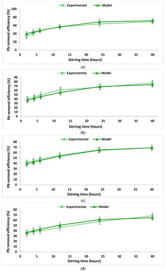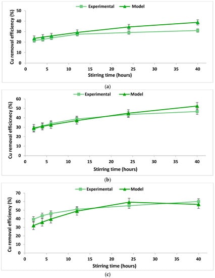 In order to verify the integrity and conformity of the mathematical model obtained (Table 3), a comparison was performed between the data calculated using the proposed mathematical model and real experimental data obtained in the laboratory. The comparison is illustrated in Figure 3 and Figure 4. The accuracy of the obtained mathematical models was tested by calculating the concordance dispersion between the experimentally obtained values and those calculated based on the models. The calculated values of the concordance dispersion indicate a good agreement between the developed models and the real process they describe. Moreover, higher values of the R2 coefficients were obtained from the experiments regarding the removal of lead as compared to those obtained from experiments regarding the removal of copper (Table 3), indicating a better agreement between the models and the real phenomenon. This fact can also be observed from the Figure 3 and Figure 4.