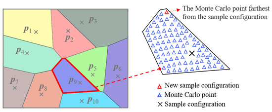 Step 3: Determination of new sample configuration. The new sample configuration is selected from . Considering that Monte Carlo random points are used to approximate the Voronoi element in the previous step, the new sample configuration is selected from the Monte Carlo random point set, and the sample configuration furthest from the is taken as the new sample configuration.