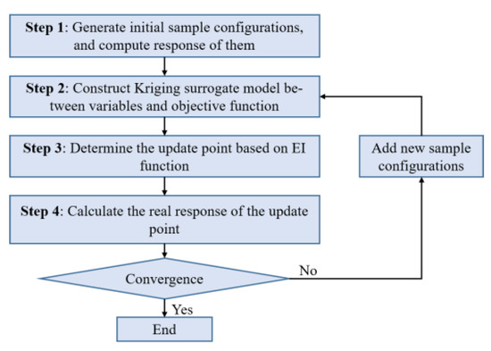 The calculation cost of the EI function is much lower than the actual response calculation cost. Intelligent algorithms such as Genetic Algorithm and Simulated Annealing Algorithm can be used to obtain the maximum expected value of EI, and the point where EI function reaches the maximum value is taken as the update point [35]. The optimization framework of EGO is shown in Figure 2, and the steps are as follows.
