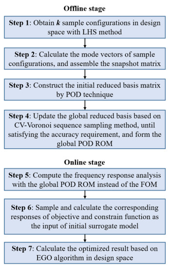 The process of vibration reduction optimization based on the global POD ROM is shown in Figure 3, which is divided into offline stage and online stage. The offline stage is the preparation stage, which is used to build and update the global POD ROM, and the online stage is the application stage, which uses the built global POD ROM for vibration reduction optimization design. The steps are as follows: