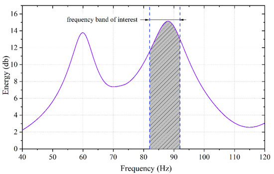 The geometric dimensions of the structure are as follows: , , , . The width and height of the fillet rectangular section on the right are and , respectively, and the fillet radius is . The radius of the circular section on the left is . The number of ring stiffeners and axial stiffeners, respectively, are 30 and 6. The height of the stiffeners is 50 mm. The thickness of skin and stiffeners of the initial configuration are 3 mm. Material properties are as follows: Young’s modulus , Poisson’s ratio , and density . The Rayleigh damping coefficient is obtained according to the previous data and set as , . The finite element model is discretized by S4 element, with 13,470 nodes, 13,680 elements and 80,820 degrees of freedom. The boundary conditions are that the inlet section is clamped, and the degrees of freedom of the outlet section is only relaxed along direction. A harmonic load with 1 N amplitude is applied to all nodes in the direction of the outlet section on the right. The analysis frequency range is [40 Hz, 120 Hz], and the frequency sweep interval is 0.1 Hz. Using the FOM, the energy–frequency curve is calculated as shown in Figure 5; the calculation takes 3752.8 s. As shown in Figure 5. Energy–frequency response of initial configuration calculated by the FOM of the S-shaped curved stiffened shell., the first resonant frequency is 60.1 Hz, and the second one is 88.0 Hz. The frequency range of interest is [88.0 Hz, 92 Hz], the energy sum of which is 1409.2 db (shown in Figure 5, shadow area).