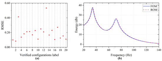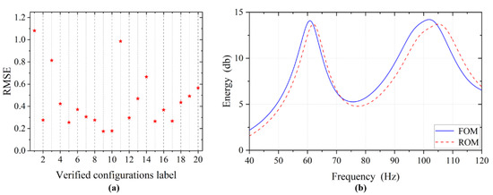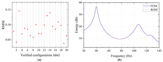 The CV–Voronoi sequence sampling method is used to increase the sample configurations to realize the adaptive global POD ROM update. According to the same test in Section 5.1, for this problem, when the maximum RMSE of energy–frequency curves of the FOM and the ROM is less than 0.15, the ROM has a relatively high precision. Therefore, the RMSE truncation threshold is set as 0.15 in this example. The convergence condition is satisfied after the continuous increase of 10 sample configurations. A global POD ROM is constructed based on 15 sample configurations. The 20 sample configurations mentioned above are used to check the accuracy of the updated ROM. The RMSE is shown in Figure 17a. The RMSE corresponding to all verified configurations is less than 0.15, and the maximum value is 0.146, which corresponds to the No. 3 sample configuration. The results based on the ROM and the FOM are shown in Figure 17b, and the curves of the two are almost completely coincidental. Compared with the accuracy of the initial ROM, the accuracy based on the updated global POD ROM is greatly improved. This shows that the updated ROM has higher prediction accuracy in the design space. The average single computation time based on the global POD ROM is 138.6 s, which is 97.6% less than the average single computation time of the FOM (5849.6 s), indicating that the proposed approach can significantly improve the computational efficiency of frequency response analysis.