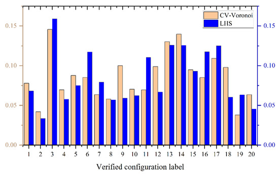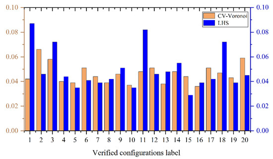 To verify the advantages of the CV–Voronoi sequence sampling method to adaptively update the global POD ROM, LHS is used to directly sample 15 configurations to construct a global POD ROM. Then, the same 20 sample configurations are used to verify the accuracy of the ROM constructed by LHS. The obtained RMSE is compared with that of the ROM constructed adaptively by CV–Voronoi sequence sampling, as shown in Figure 18. The RMSE with the CV–Voronoi sequence sampling method is generally low. The RMSE with LHS method is significantly lower at the 3, 6, 11, 16 and 17 validation configurations. This reflects the advantages of the CV–Voronoi sequence sampling method in constructing the global POD ROM.