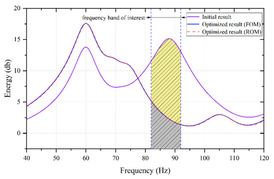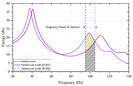 The optimized results are shown in Table 3. The optimized configuration can ensure that the first-order resonant frequency and mass satisfy the constraints, while the energy sum of the interest frequency range decreases significantly. The optimized energy sum of the interest frequency range is 1450.0 db, which is 31.5% lower than the initial value (2117.8 db). The optimized configuration has no resonance frequency in the [95 Hz, 105 Hz], and the energy–frequency curve has no peak value in this frequency range, which is also the main reason why the energy sum of interest decreases significantly. Figure 20 shows the energy–frequency curves before and after the vibration reduction optimization of the PAF structure. The energy–frequency curve of the optimized configuration is calculated based on the global POD ROM and the FOM, which almost completely coincide with each other. The Te is 1439.72 db and 1450.0 db, respectively, and the relative error is only 0.7%. The accuracy and credibility of the optimized analysis results based on the global POD ROM are verified.
