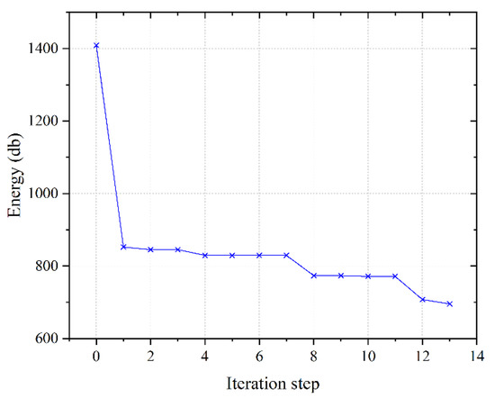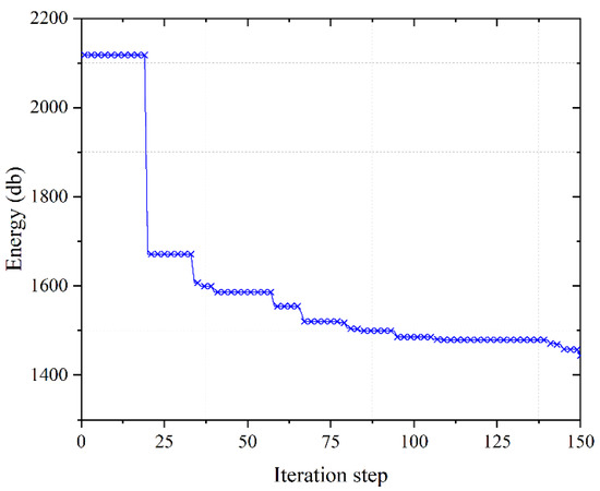 Furthermore, the global POD ROM is used instead of the FOM for the vibration reduction optimization design of the PAF structure. In the optimization design stage, 50 sample configurations are selected to calculate the corresponding responses to construct the initial Kriging surrogate model. The upper limit of iteration is 300. The iteration stops when the maximum number of iteration steps is reached or Formula (27) is satisfied. The iterative convergence curve is shown in Figure 19.