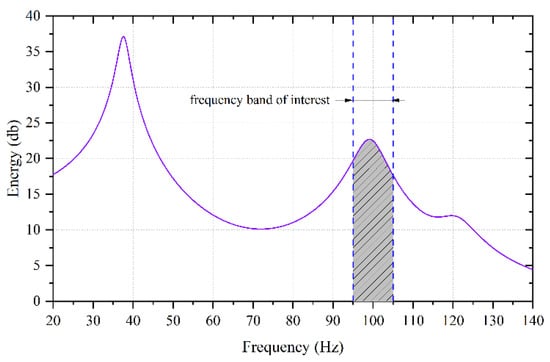 The geometric sizes of the PAF structure are as follows: , , and . The number of U-shaped stiffeners is eight, and the flange and web are 20 mm and 15 mm, respectively. The number of ring stiffeners is one, the height of the stiffener is 15 mm. The thickness of all skin and stiffeners in the initial configuration of the structure is 3 mm. The shell thickness of the simplified satellite structure is 15 mm and the size is mm. The satellite is separated by square thin shells at 130 mm and 270 mm relative to the height of itself. The hole is symmetrical at the top of satellite, the diameter is 205 mm, the distance of the center of the two circles is 225 mm, and the circular interface is 20 mm high. The material properties are as follows: Young’s modulus , Poisson’s ratio , density , and the Rayleigh damping coefficient of the whole structure is obtained according to the previous data and set as ,. The finite element model is discretized by S4 and S3 elements, with 19,282 nodes, 18,928 elements and 115,692 degrees of freedom. The edge of the lower end frame is fixed, and the harmonic load of amplitude 1 N is applied to all nodes in the x, y and z directions of the two circular interface boundaries at the top of the satellite. The analysis frequency range is [20 Hz, 140 Hz], and the frequency sweep interval is 0.1 Hz. The FOM is used to calculate the energy-frequency curve, as shown in Figure 15, which takes 5849.6 s. As can be seen from Figure 15, the first resonance frequency of the structure is 37.6 Hz, the second resonance frequency is 99.3 Hz, and the energy sum in the frequency range of interest [95.0 Hz, 115.0 Hz] is 2117.8 db (shaded area in Figure 15).